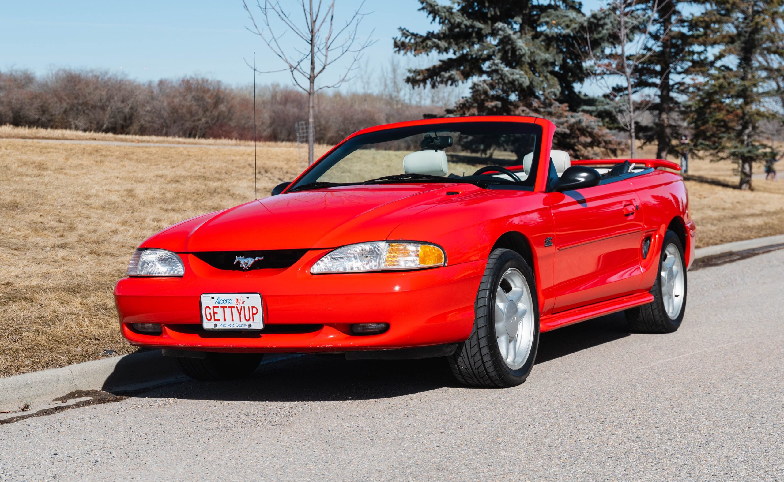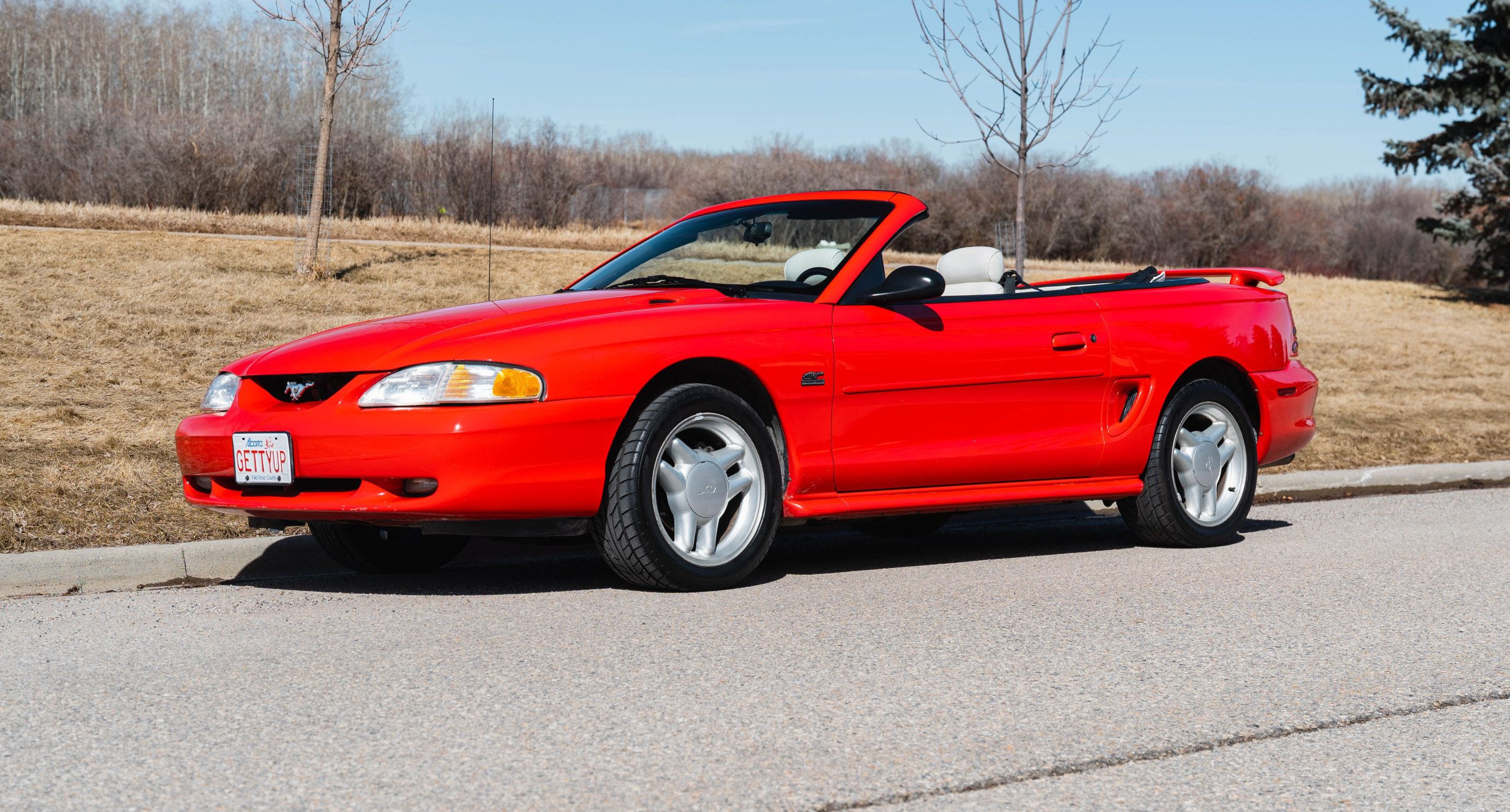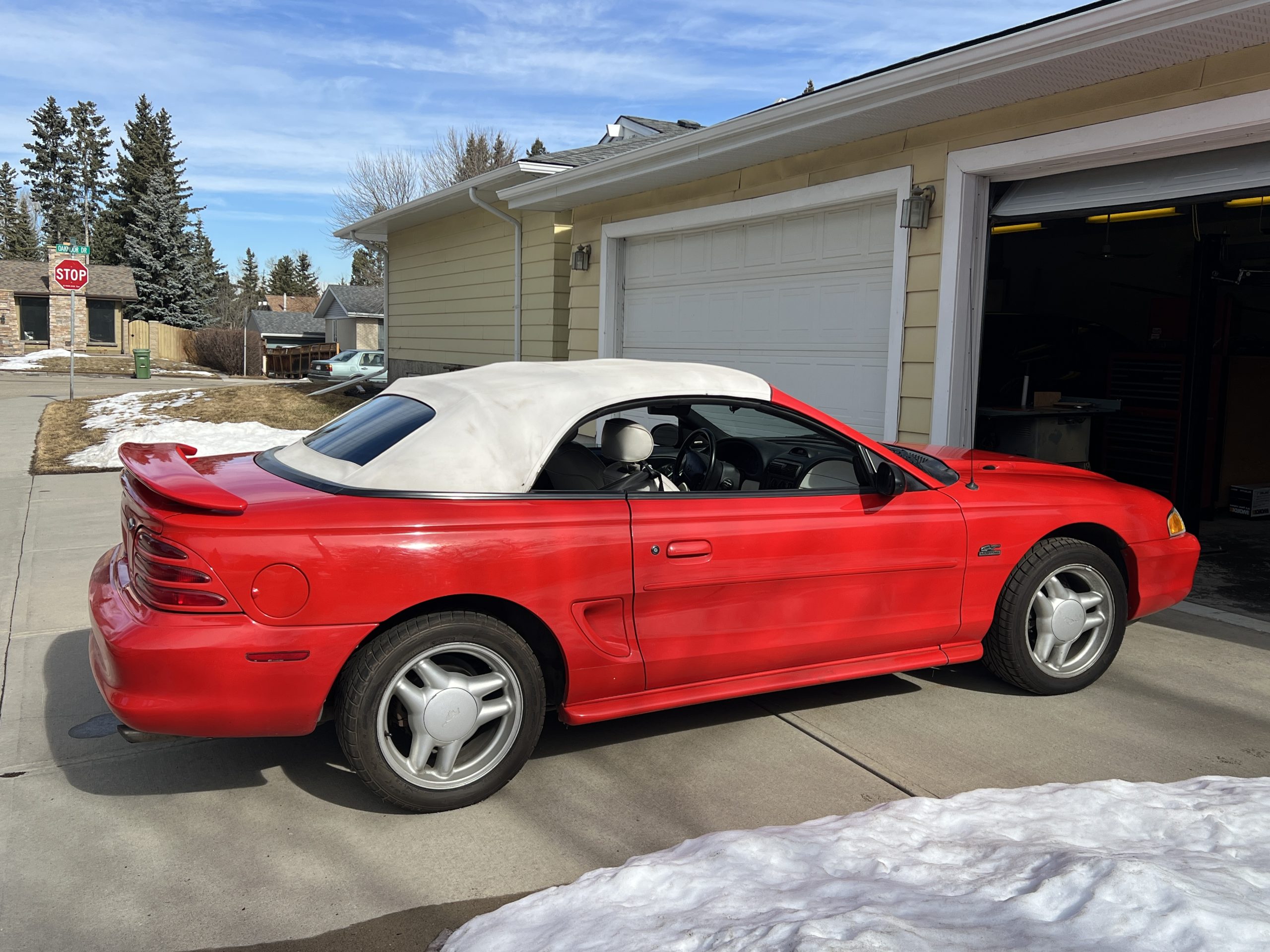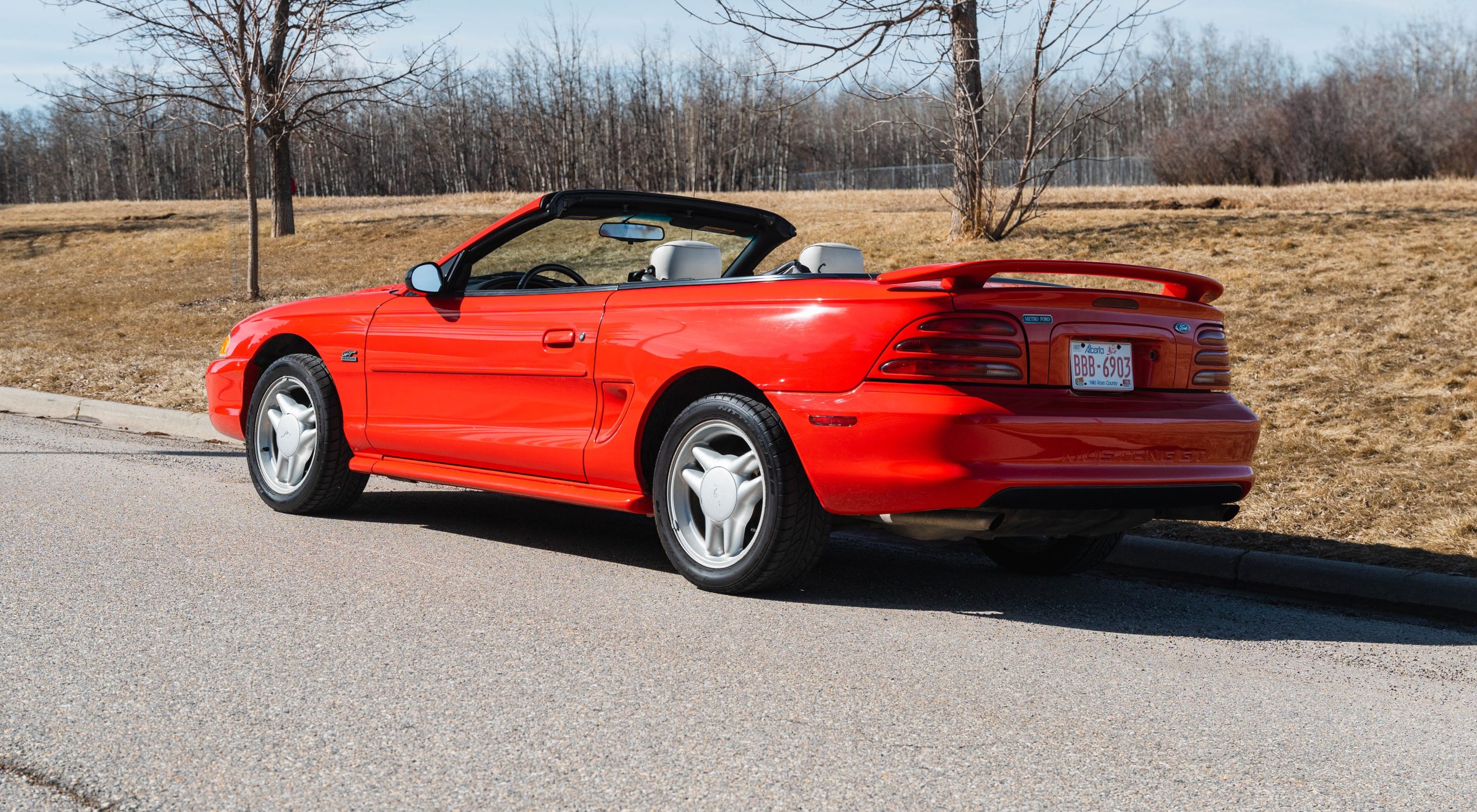 1994 Mustang GT Convertible, which is a 30th year Anniversary special edition car. – First year of revised body style after the Fox Body – It retains the proven 5.0L V8 engine that successfully powered the Mustang for many years. This is originally a Calgary car (Metro Ford) with one-family history of ownership. It has just shy of 110,000 kms. It is never winter driven and always stored inside. It bears only minor blemishes typical of a well cared for, but gently driven car of 32 years old. No apparent cracks on windshield – this car is ready to drive and be appreciated by the next Mustang enthusiast or anyone looking for a great summer cruising vehicle.