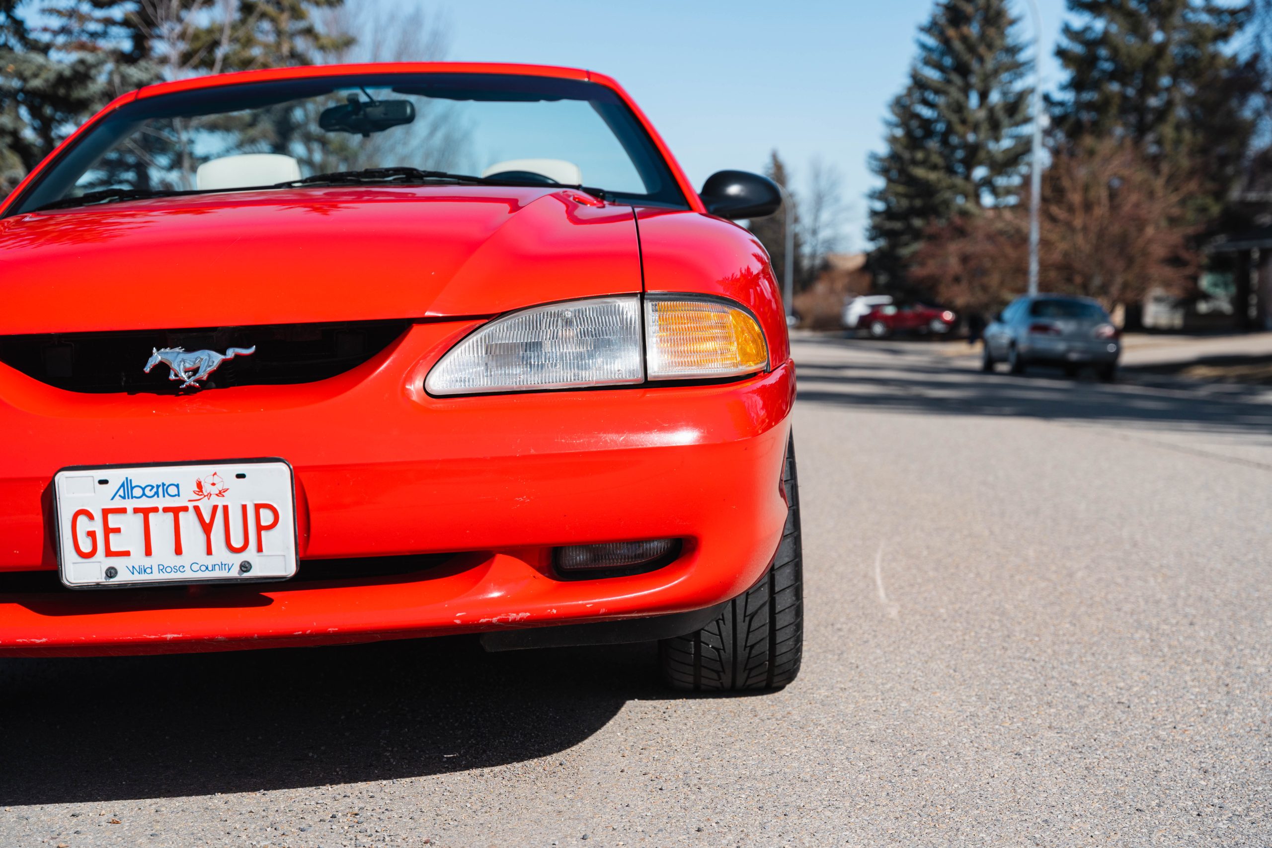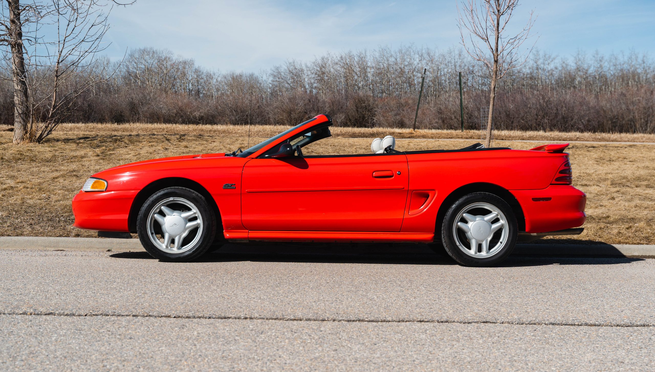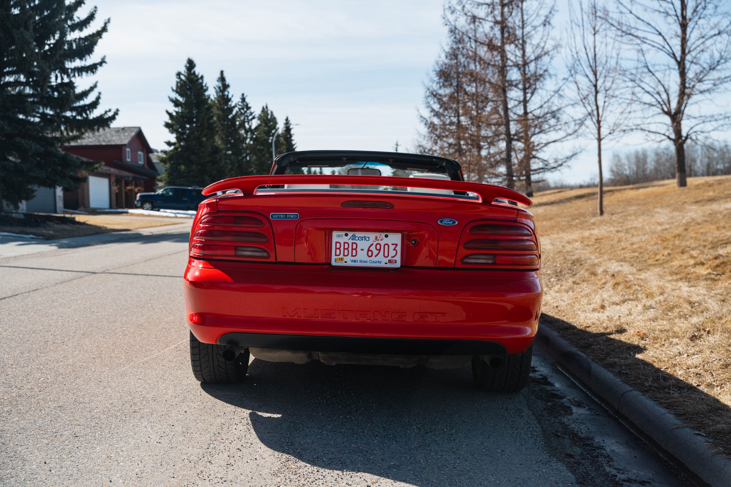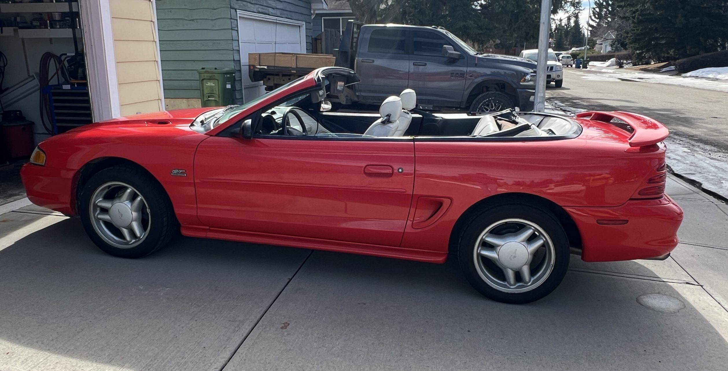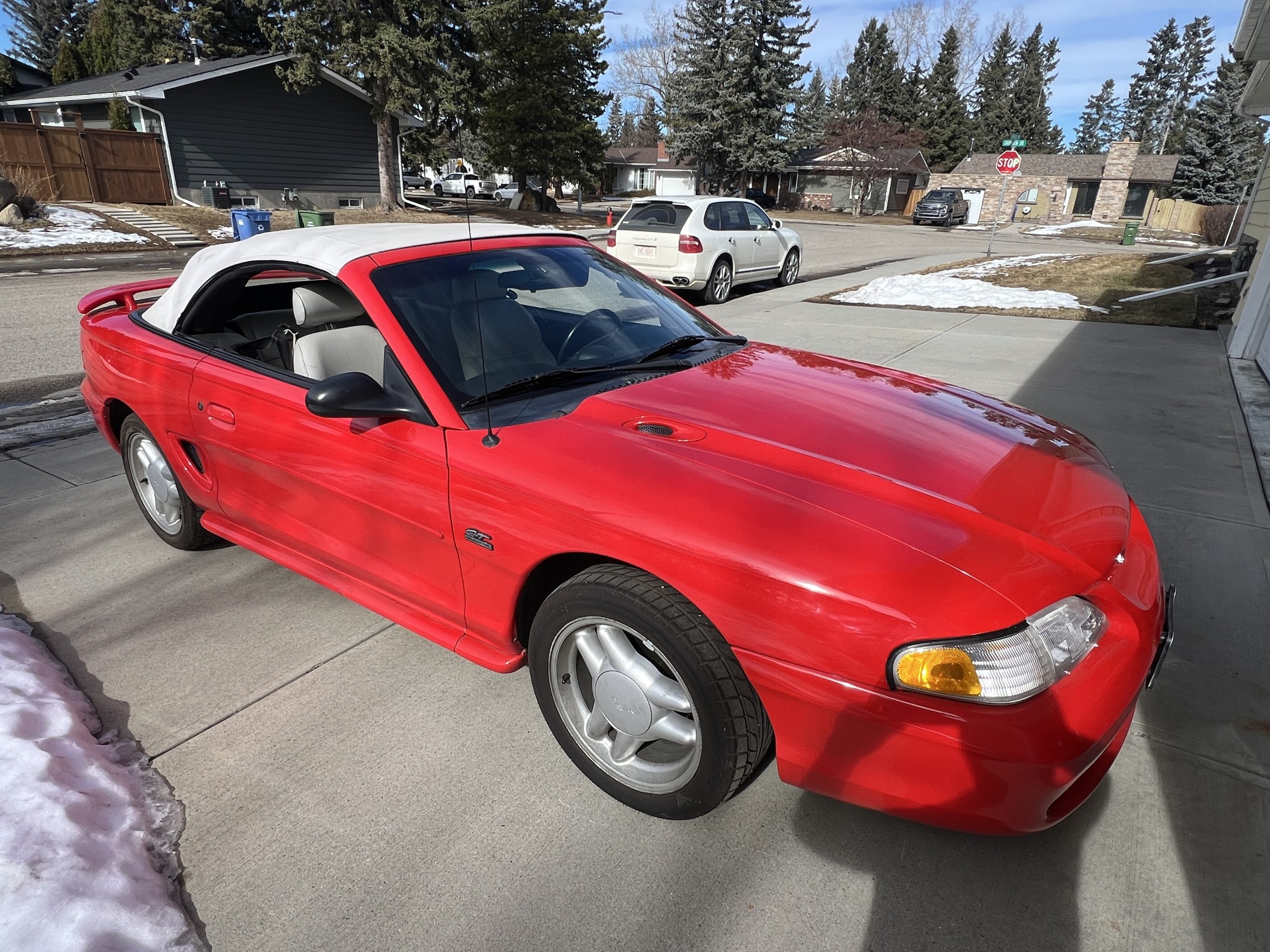 1994 Mustang GT Convertible, which is a 30th year Anniversary special edition car. – First year of revised body style after the Fox Body – It retains the proven 5.0L V8 engine that successfully powered the Mustang for many years. This is originally a Calgary car (Metro Ford) with one-family history of ownership. It has just shy of 110,000 kms. It is never winter driven and always stored inside. It bears only minor blemishes typical of a well cared for, but gently driven car of 32 years old. No apparent cracks on windshield – this car is ready to drive and be appreciated by the next Mustang enthusiast or anyone looking for a great summer cruising vehicle.