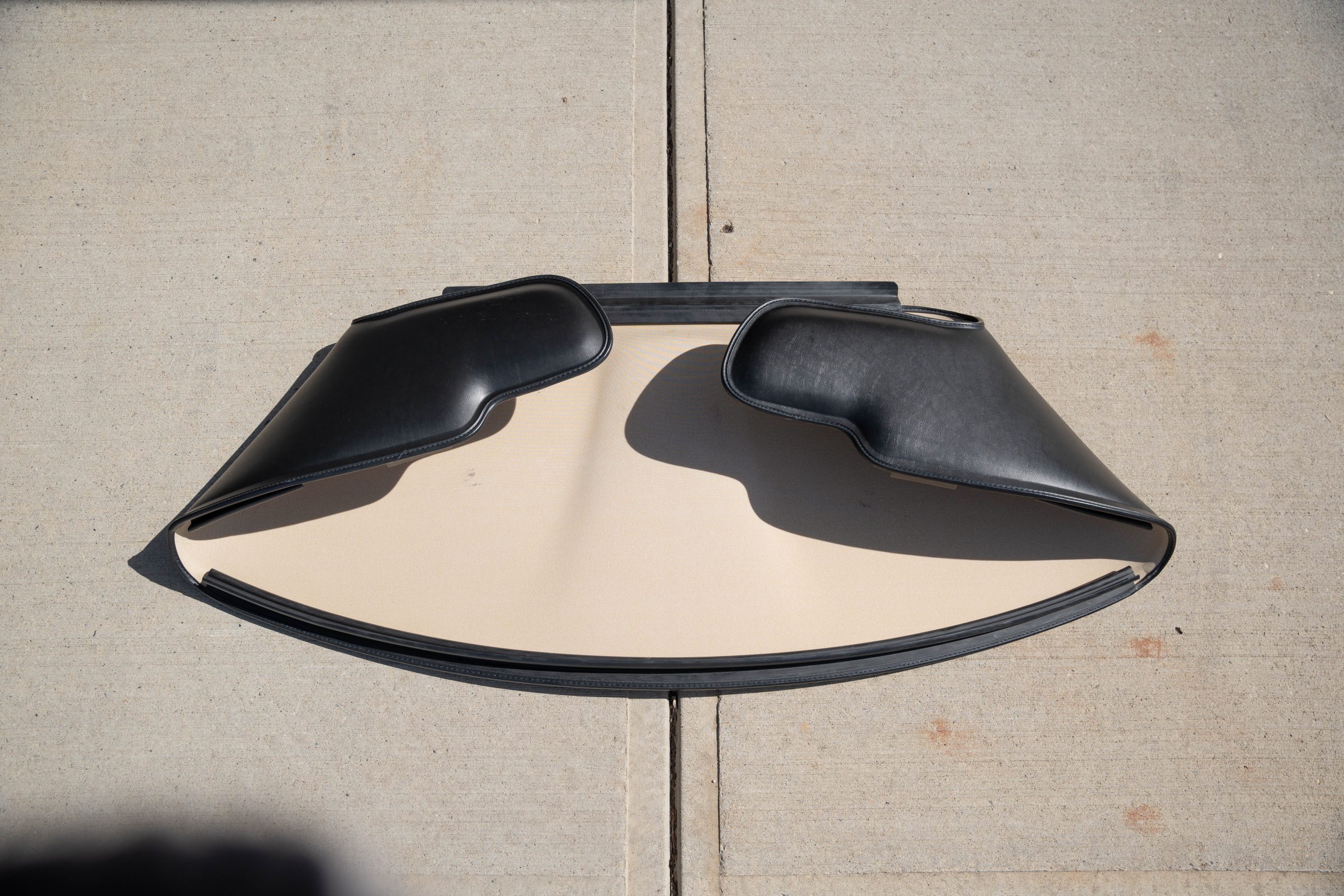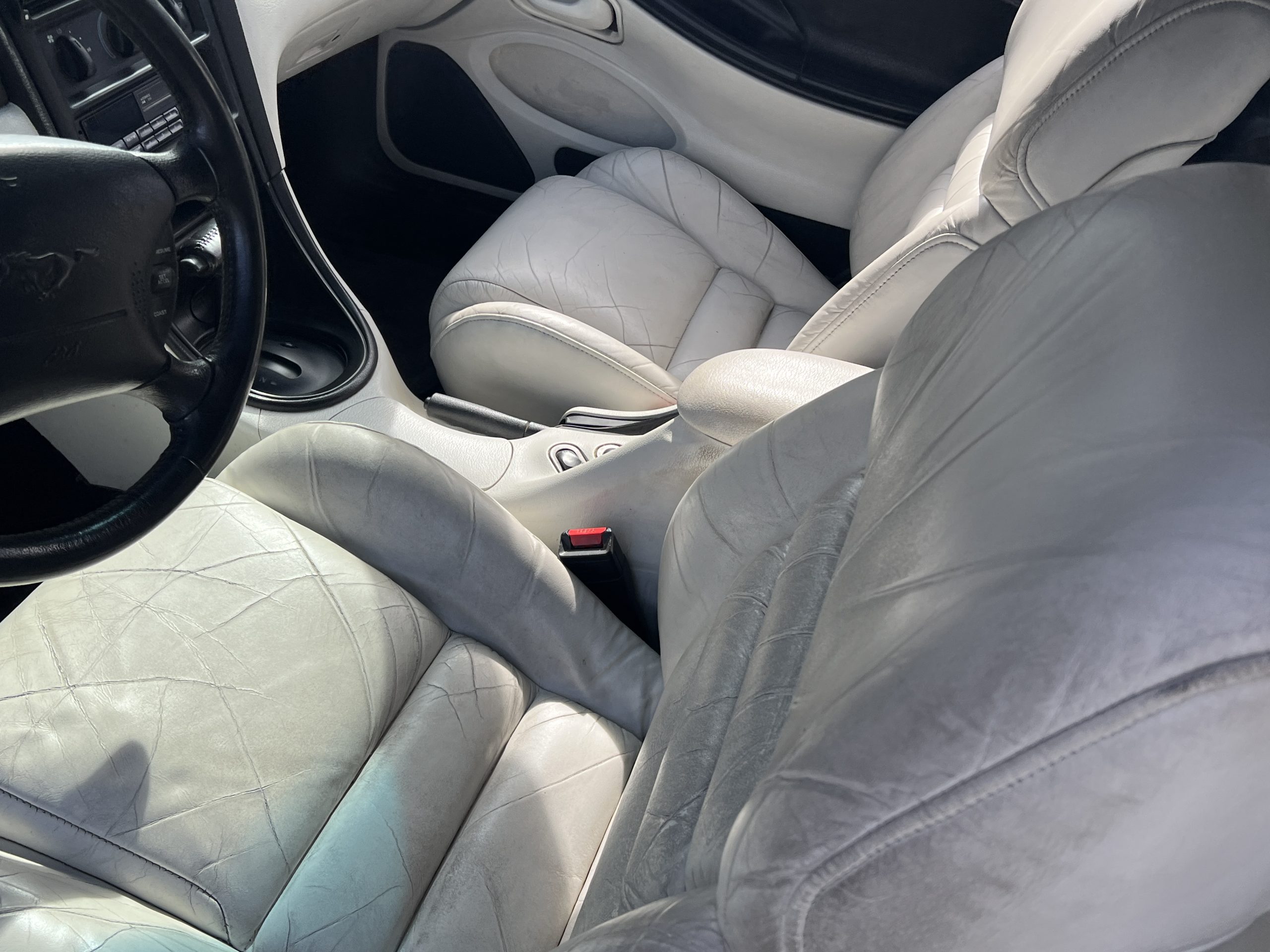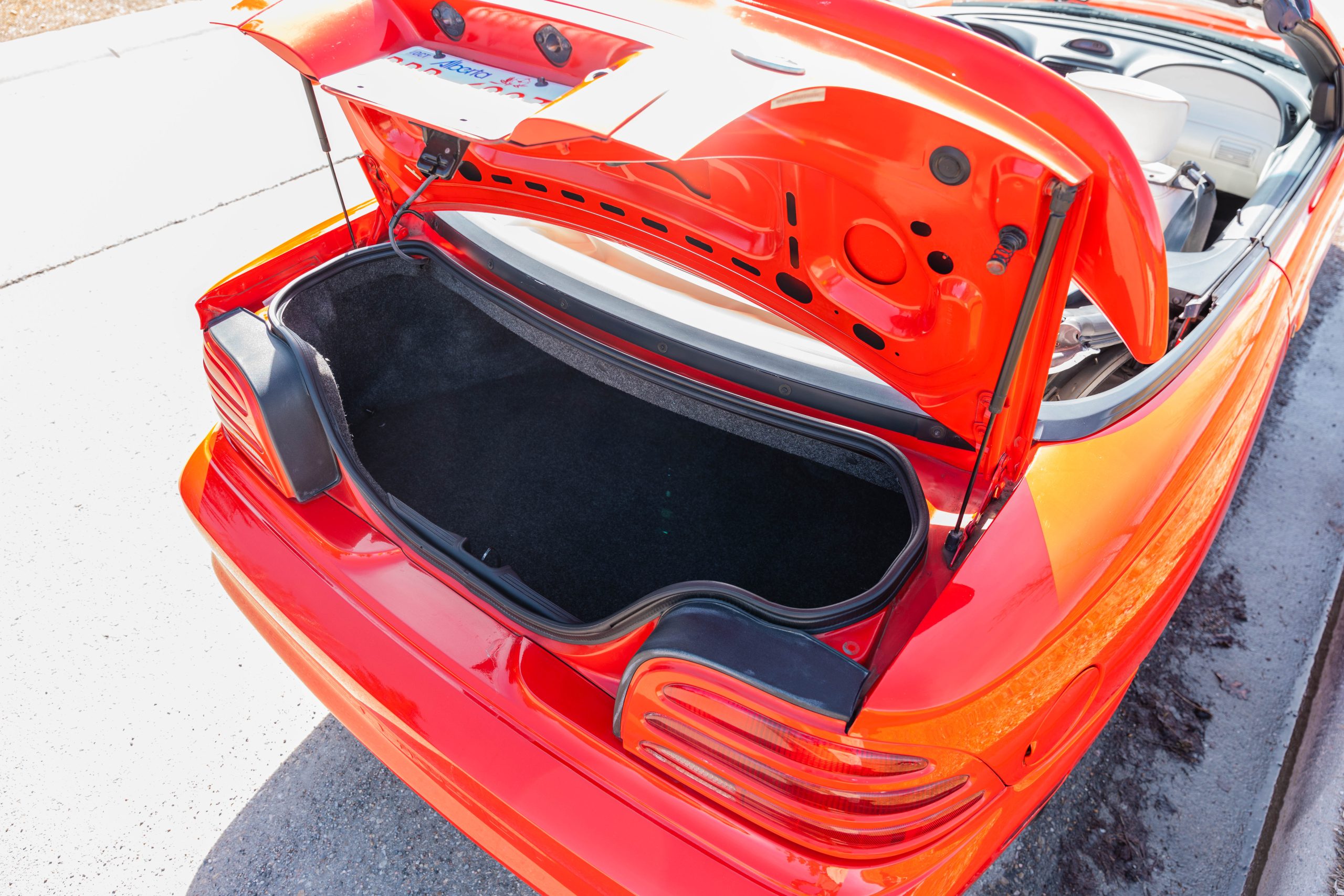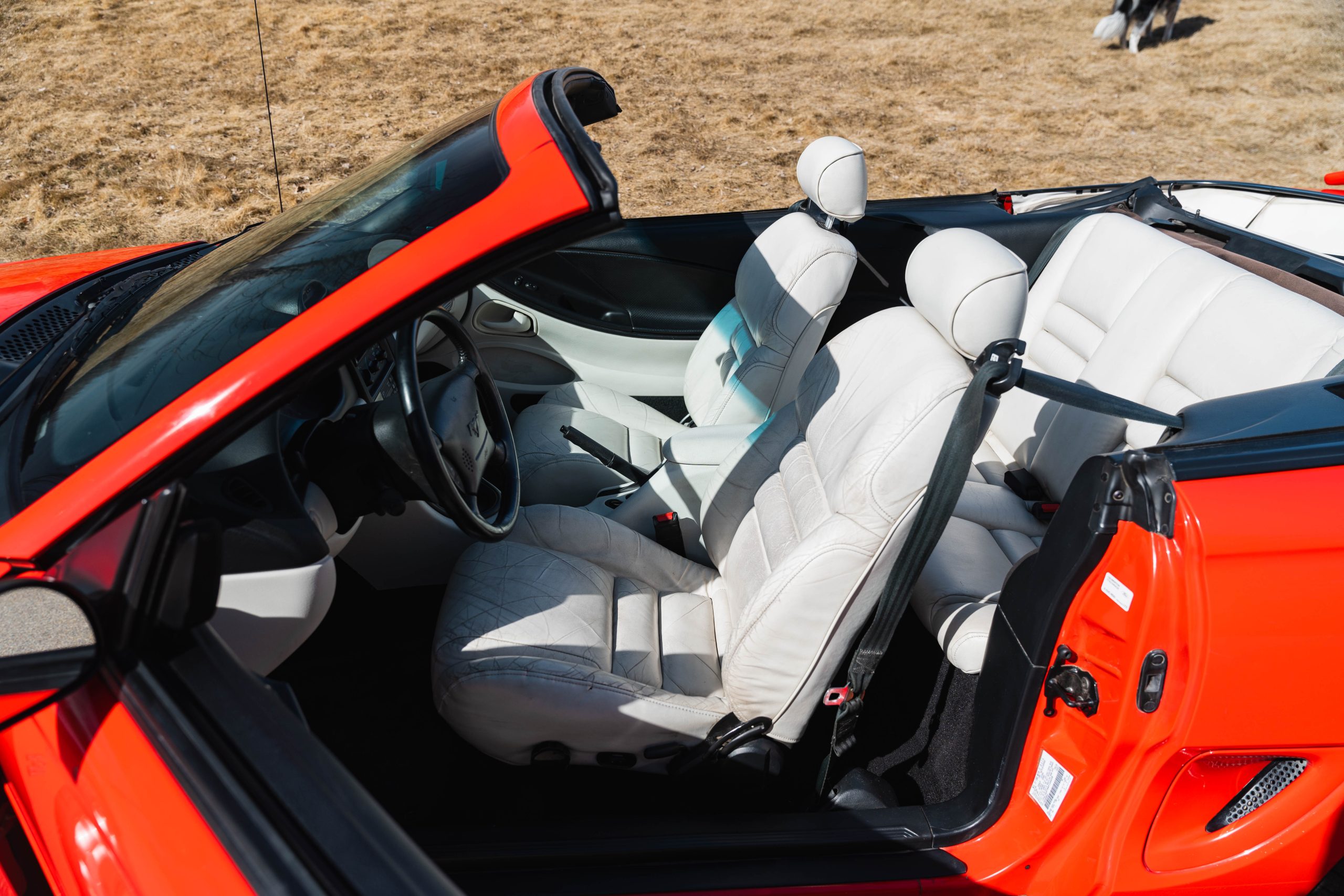 All original – No modifications; rear bumper has a repaint (with no structural repair required) way back in its first year. The latch on the driver’s side convertible top closes but needs adjustment. Roof is white and in good condition; Interior boast white leather also in good condition.