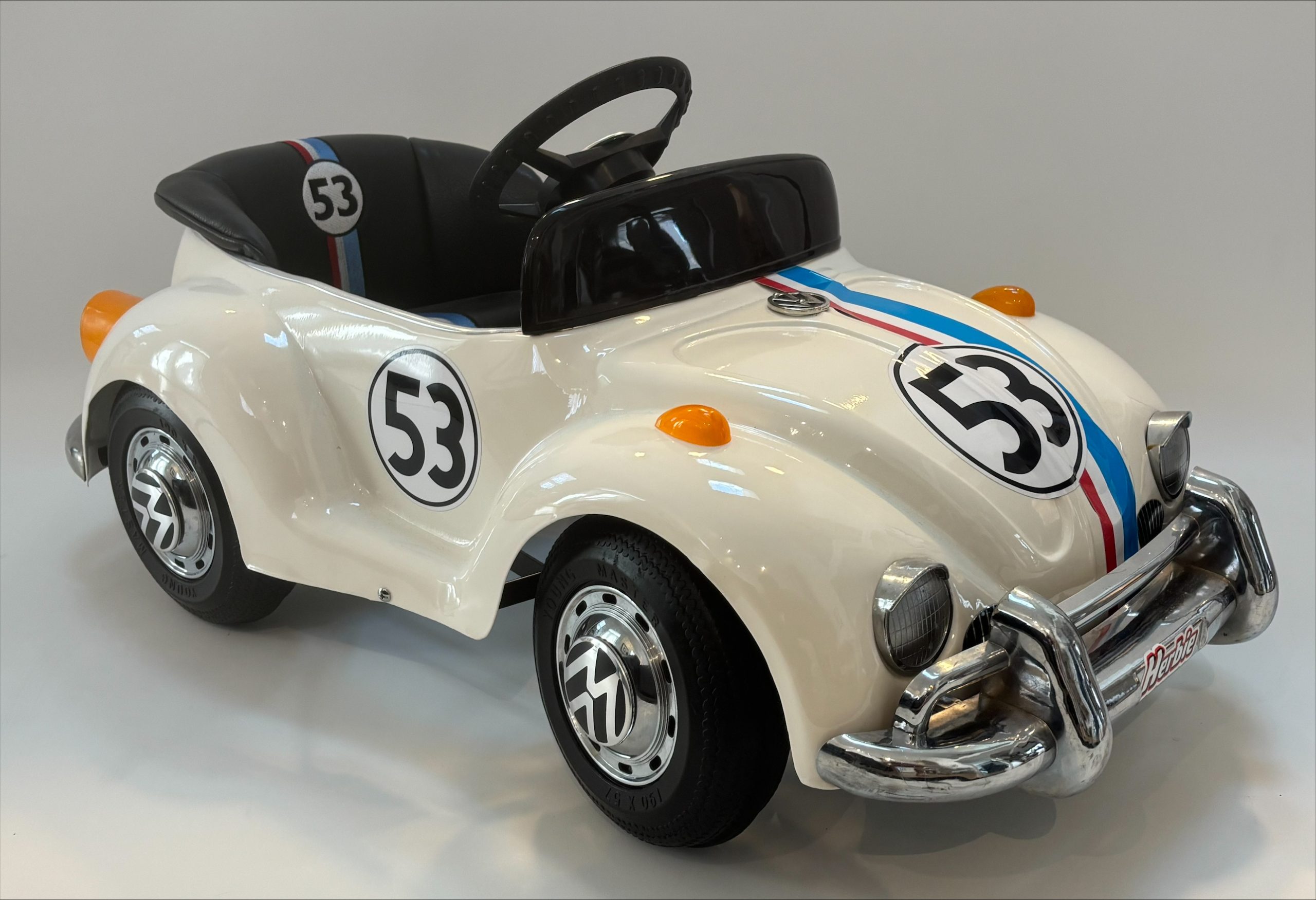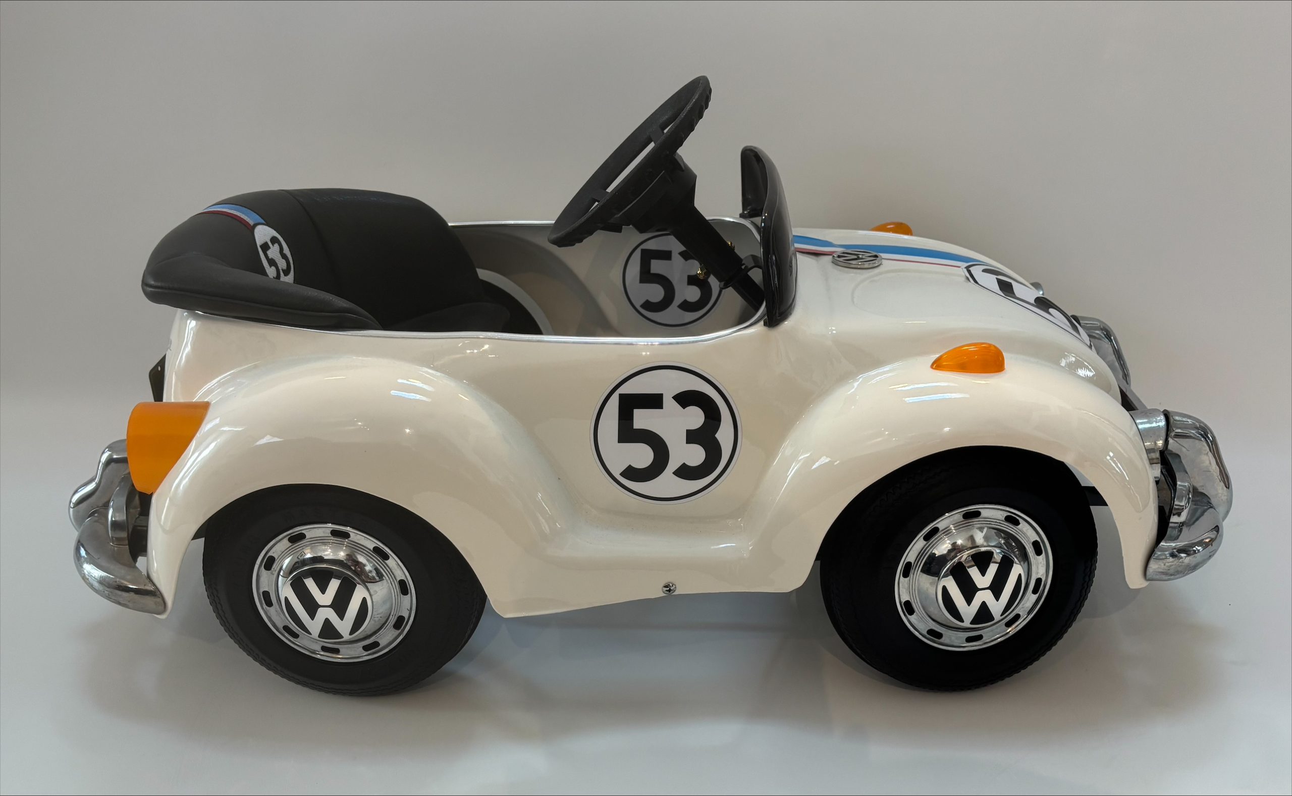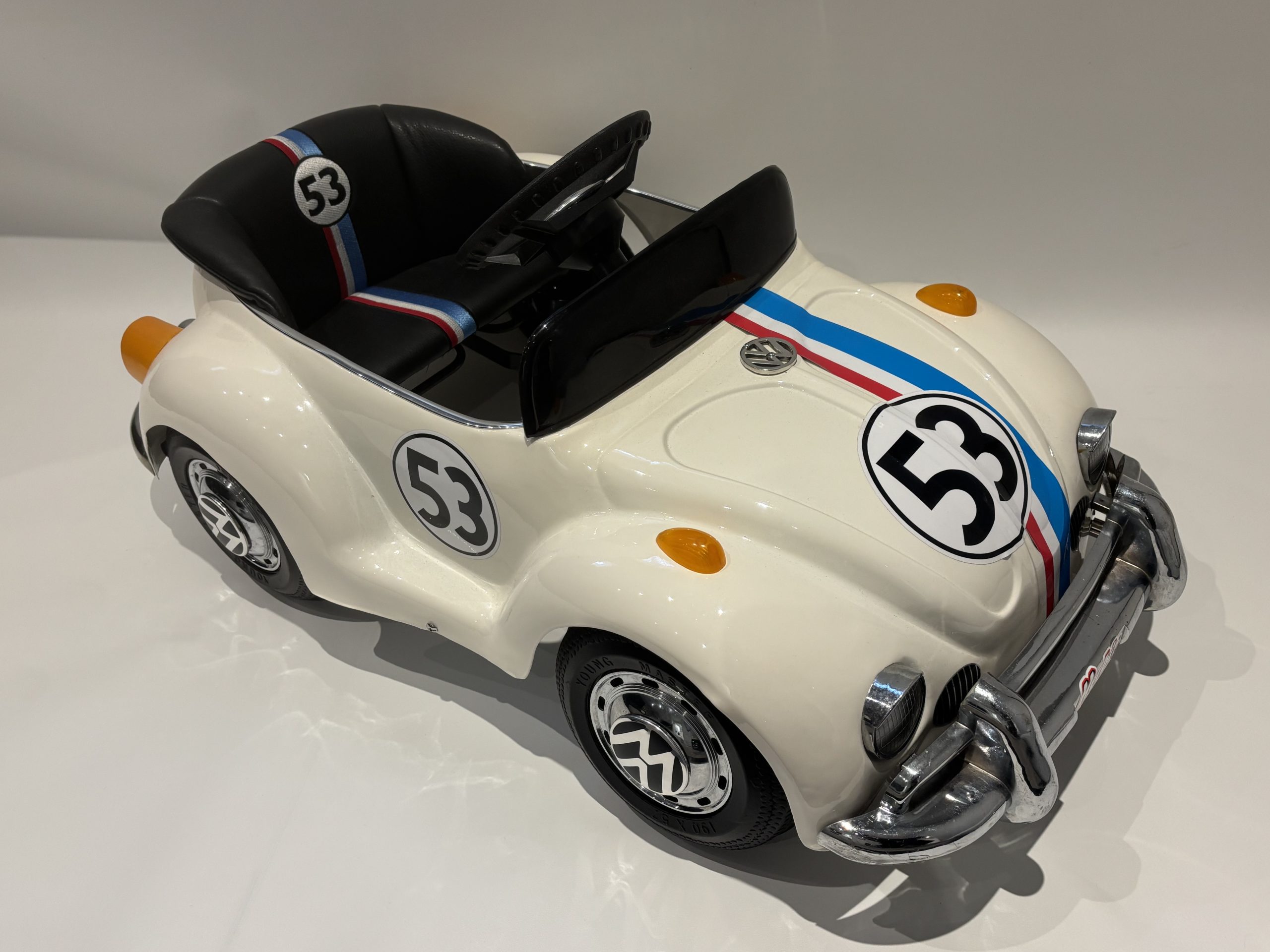 The Prestige Mini Motors Volkswagen Beetle pedal car is a collectible children’s ride-on vehicle styled after the iconic classic Beetle produced by Volkswagen. This example has been custom restored and finished as a tribute to Herbie, the beloved racing Beetle featured in the Disney film series beginning with The Love Bug (1968).