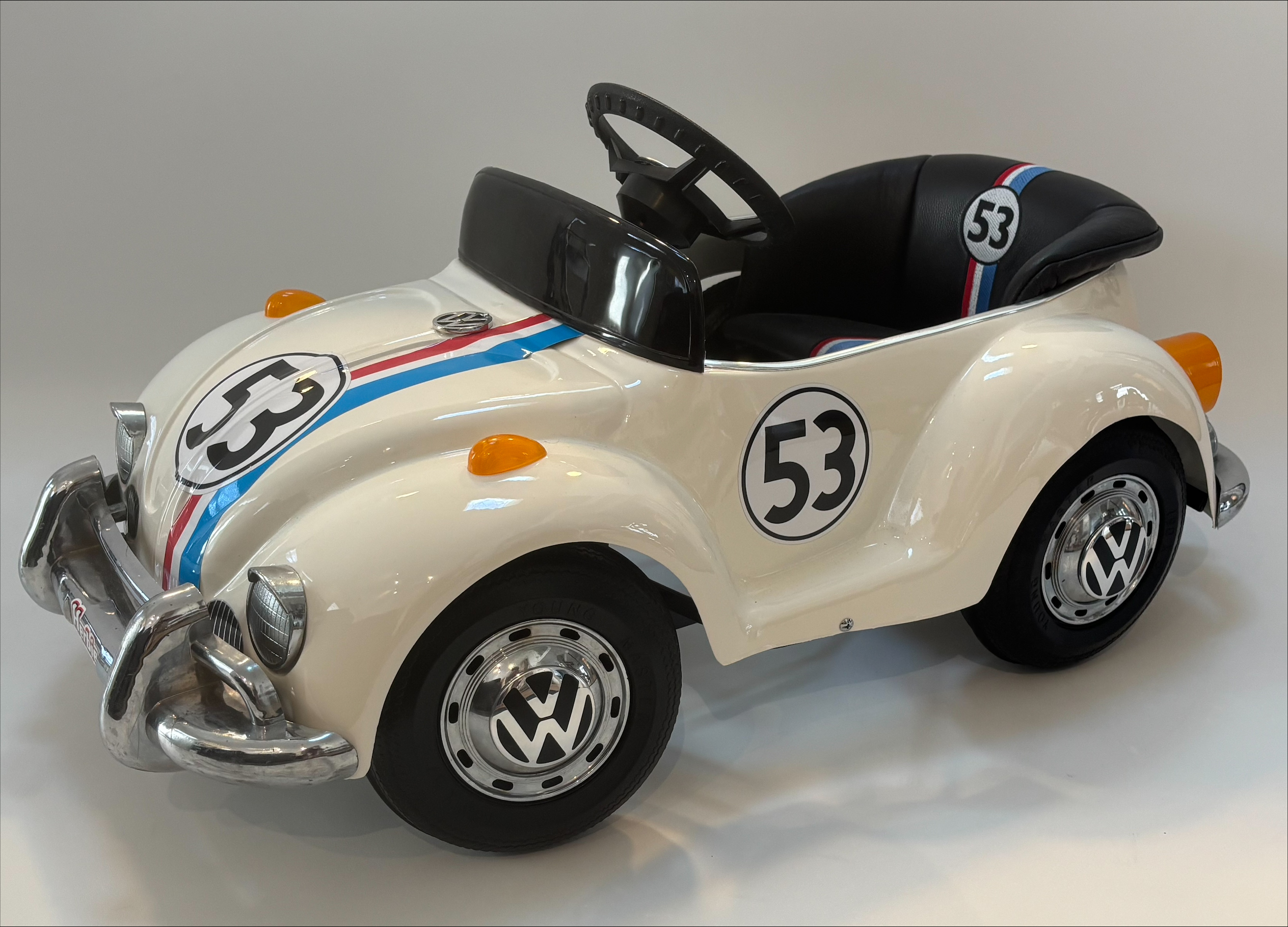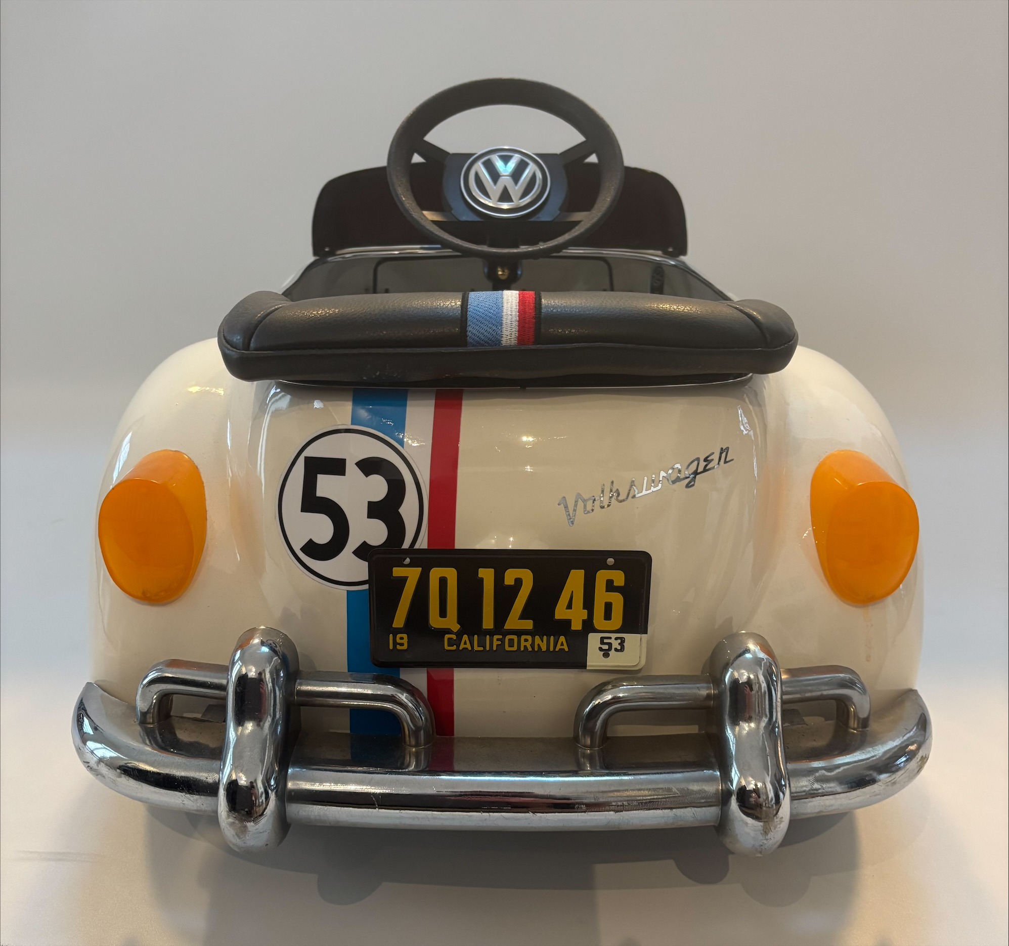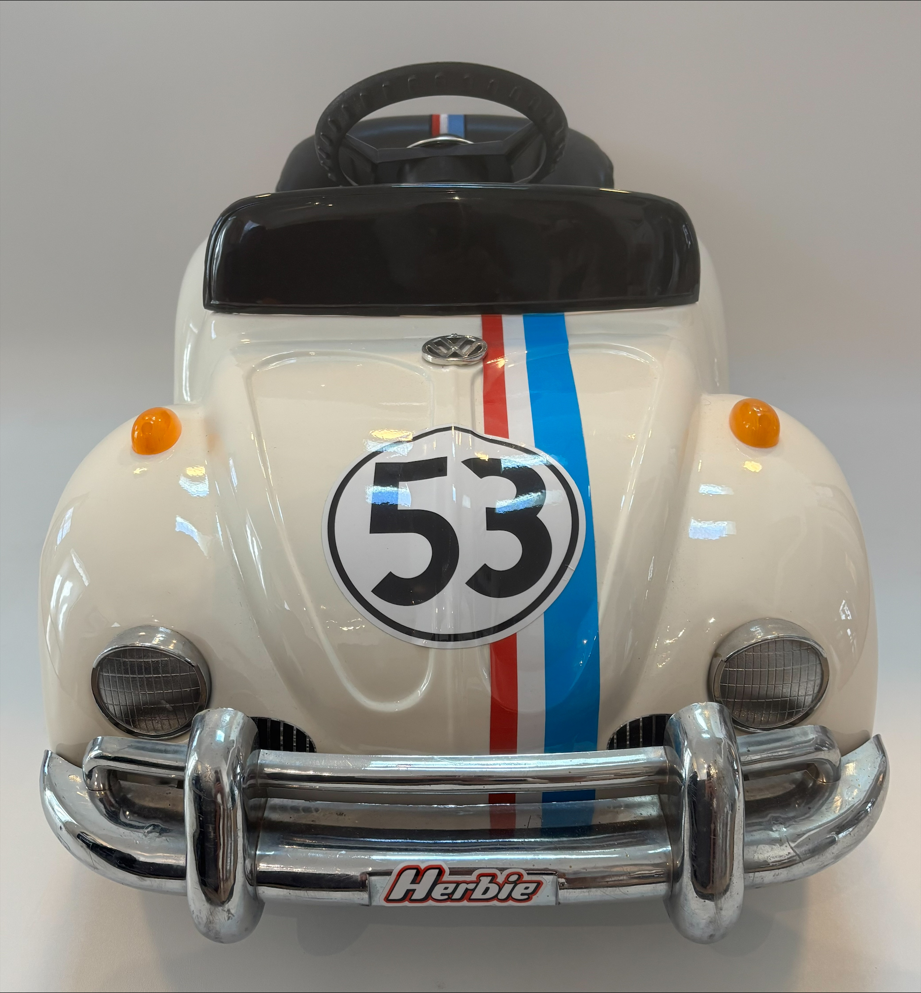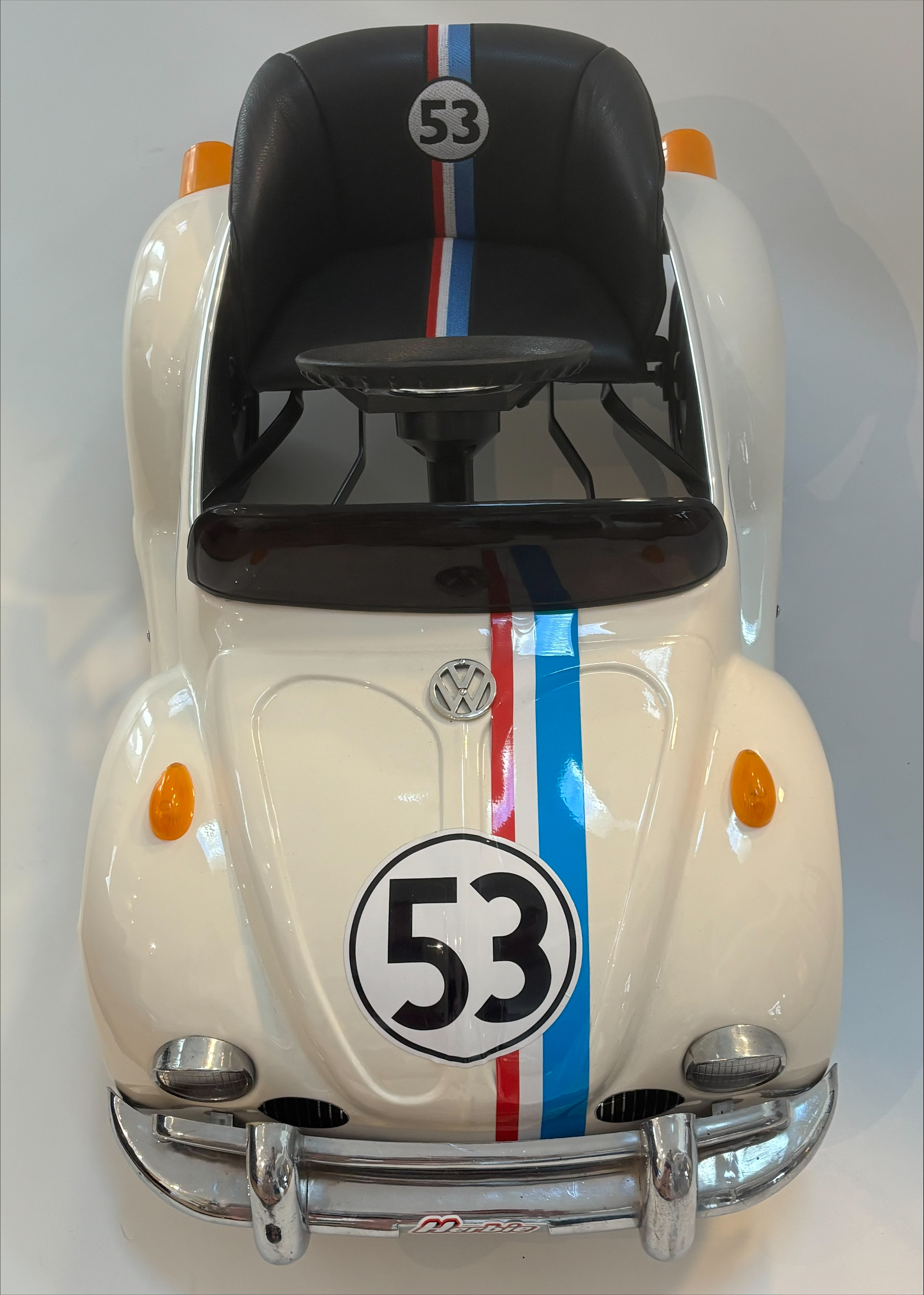 The pedal car captures the unmistakable shape of the original Beetle with rounded fenders, curved roofline, and compact proportions. In this restoration the vehicle has been finished in the classic white Herbie racing livery, complete with red, white, and blue racing stripes and the famous number 53, recreating the appearance of the movie car while preserving the charm of a vintage children’s pedal vehicle.