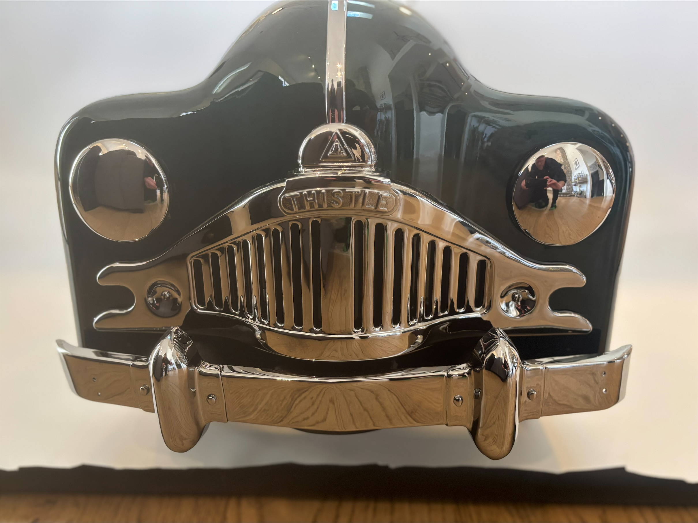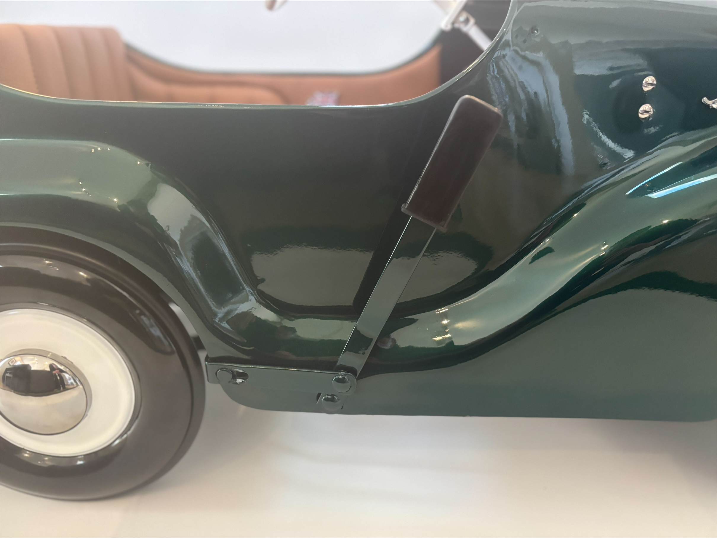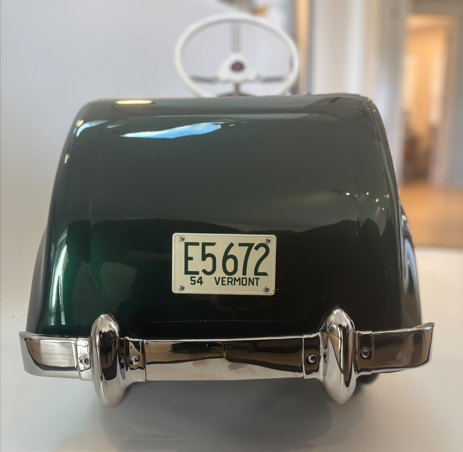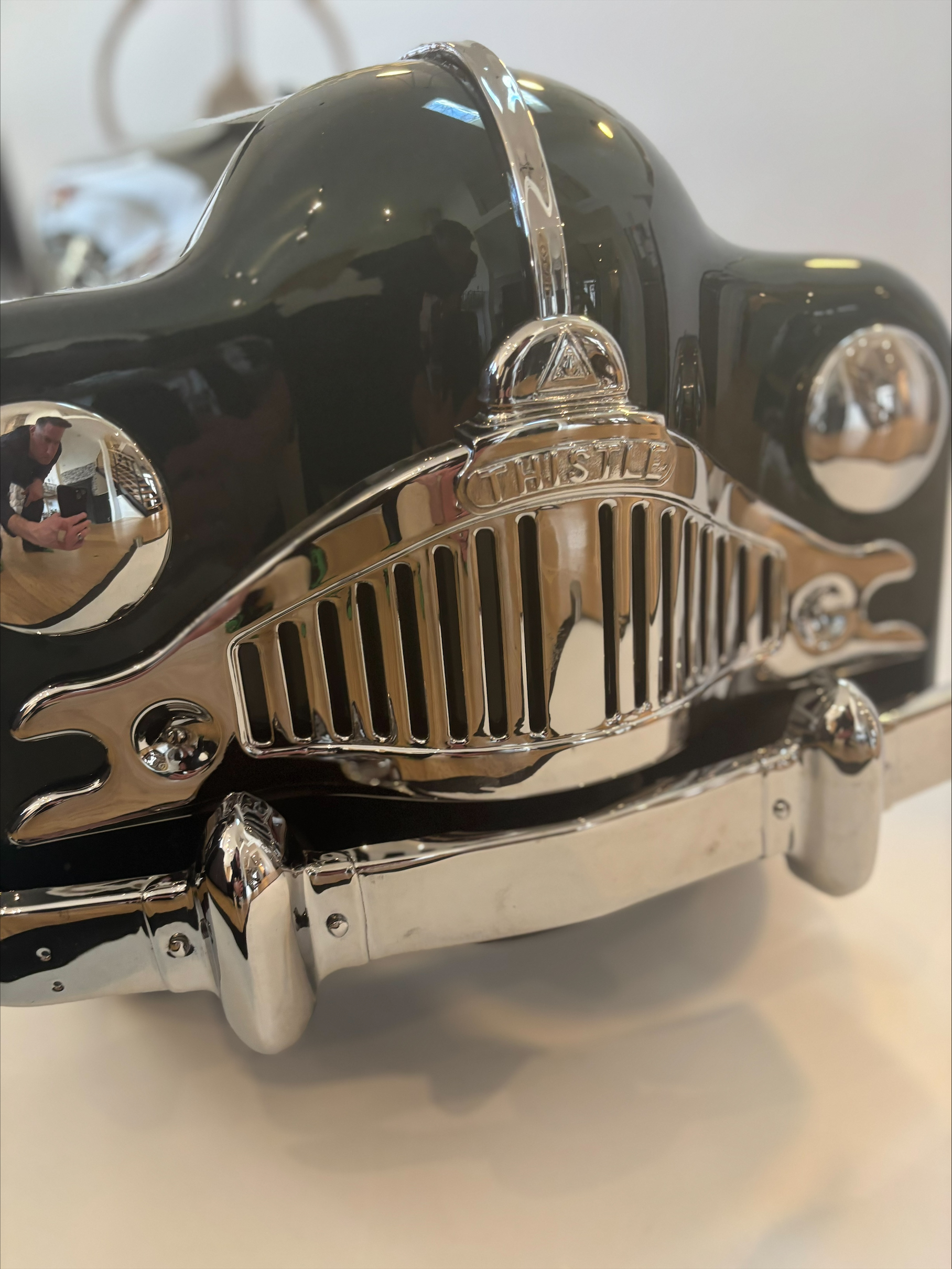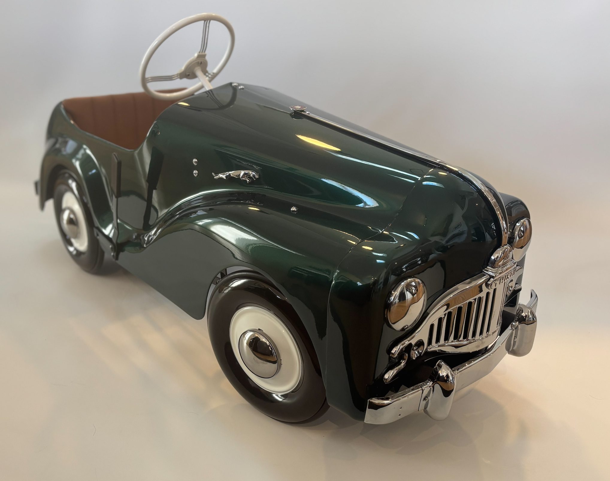 Overview The Thistle “President” pedal car is a classic mid-century children’s ride-on toy produced in Canada during the late 1940s to early 1950s. Manufactured by Thistle Toys of Toronto, the President model was designed to resemble the large, flowing lines of post-war North American automobiles. The pedal car features a pressed steel body, working steering wheel, metal wheels with rubber tires, and a pedal-driven drivetrain. Its broad fenders, large grille opening, and rounded body panels reflect the styling trends of luxury automobiles from the immediate post-war era. Year / Model / Origin • Era: Late 1940s – early 1950s • Type: Pedal-powered children’s ride-on toy • Manufacturer: Thistle Toys Ltd., Toronto, Canada • Construction: Pressed steel body with metal wheels and rubber tires • Design Features: Large rounded fenders inspired by late-1940s automobiles; prominent grille opening and trim details; functional steering wheel and pedal drivetrain; sturdy steel chassis typical of post-war toy manufacturing • Production: The “President” model appeared in Canadian toy catalogues during the post-war boom in children’s ride-on toys Restoration Highlights • Found in Bracebridge, Ontario • Automotive quality British racing green paint • Handcrafted leather interior with British badging • Hand painted white wheels • Authentic Jaguar Decals and steering wheel center cap • Custom two tone powder coated steering wheel • 1953 Vermont plate Company History — Thistle Toys Ltd. Thistle Toys Ltd. was a Canadian toy manufacturer based in Toronto, Ontario, active primarily during the 1930s through the 1950s. The company became known for producing durable pressed-steel toys including pedal cars, wagons, scooters, and tricycles. During the post-World War II economic expansion, pedal cars became highly popular as children’s toys that mirrored the styling of real automobiles. Thistle’s pedal cars were well regarded in Canada for their robust construction and distinctive styling, and today surviving examples are considered desirable collectibles among vintage toy enthusiasts. Estimated Market Value (2026 Market Observations) Professionally restored / excellent examples: Approximately $1,500 – $3,000 CAD. Value depends heavily on originality and completeness, condition of paint and body panels, mechanical functionality, authentic parts and restoration quality, and provenance.